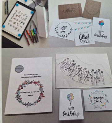 Erlerne eine Basic-Schriftart sowie Mal- und Mischtechniken mit Aquarell. Gemeinsam erstellen wir Karten, Türschilder, Bilder, Lesezeichen etc., die ihr natürlich mit nach Hause nehmen